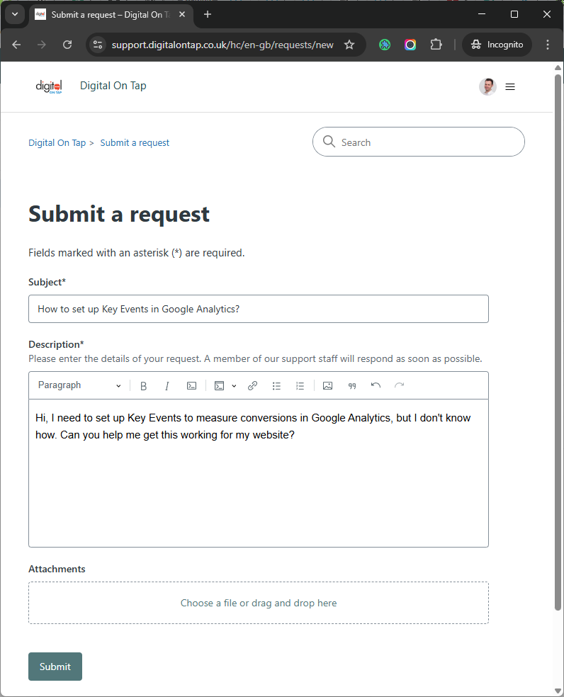 You can only have one ticket open at a time. If your question cannot be easily answered and requires substantial time to deal with, we’ll let you know that it is outside the scope of our standard support, why that’s the case & what the cost is to resolve it.